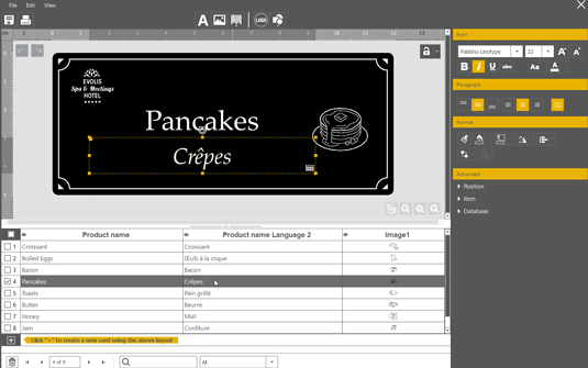 Die Edikio Guest Software umfasst eine Bibliothek mit über 200 Etikettenvorlagen und mehr als 350 Piktogrammen, mit denen Sie Ihre Buffet-Etiketten und andere Karten individuell gestalten können.