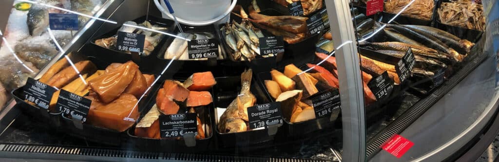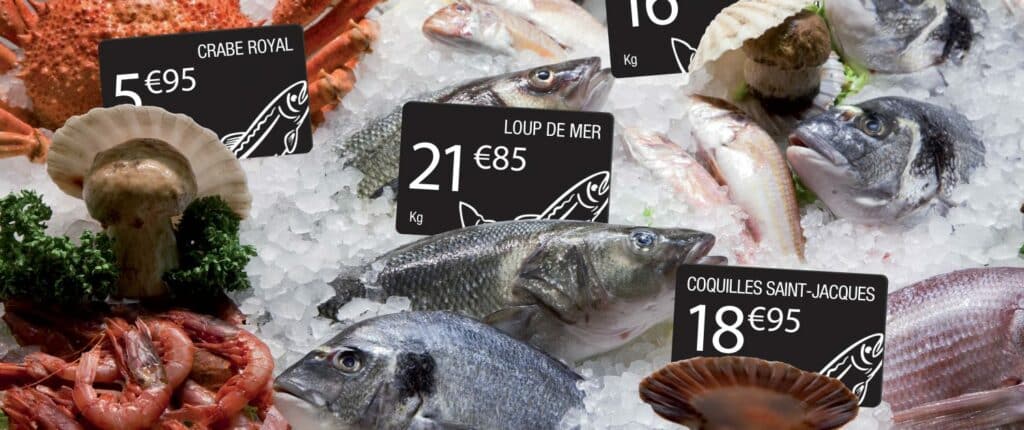 Preisschilder für die Fischtheke eines Supermarkts