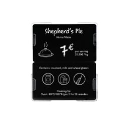 - Alle für den Verbraucher notwendigen Informationen mithilfe von Standardkarten im CR80-Format deutlich anzeigen: Zutaten, Preis, Allergene, Produktionsmethode, Herkunft, Nährwertangaben, zweisprachige Kommunikation.