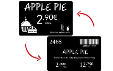 Essgewohnheiten (koscher, halal, vegan, etc.) Diätetische Einschränkungen (glutenfrei, milchfrei, zuckerfrei usw.) Spezifische Kennzeichnung (lokales, biologisches, selbstgemachtes Produkt usw.) Zeigen Sie mehrere Preise auf demselben Etikett an : Preis pro Einheit und Preis pro Kilo, Liter usw. Werbeverkaufspreis