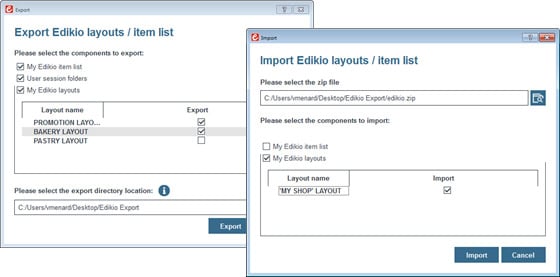 Sie können die Artikelliste oder Etikettenvorlagen, die Sie mit der Edikio-Software erstellt haben, exportieren, um sie auf anderen Computern zu verwenden, die ebenfalls mit Edikio ausgestattet sind. Sichern Sie Ihre gesamte Edikio-Sitzung. Ermöglicht das Exportieren von Artikellisten und/oder Vorlagen im „.zip“-Format und das anschließende Importieren auf anderen Computern. Ideal für Einzelhändler, die damit Etikettenvorlagen und Kategorien nur einmal für alle ihre Verkaufsstellen erstellen können.
