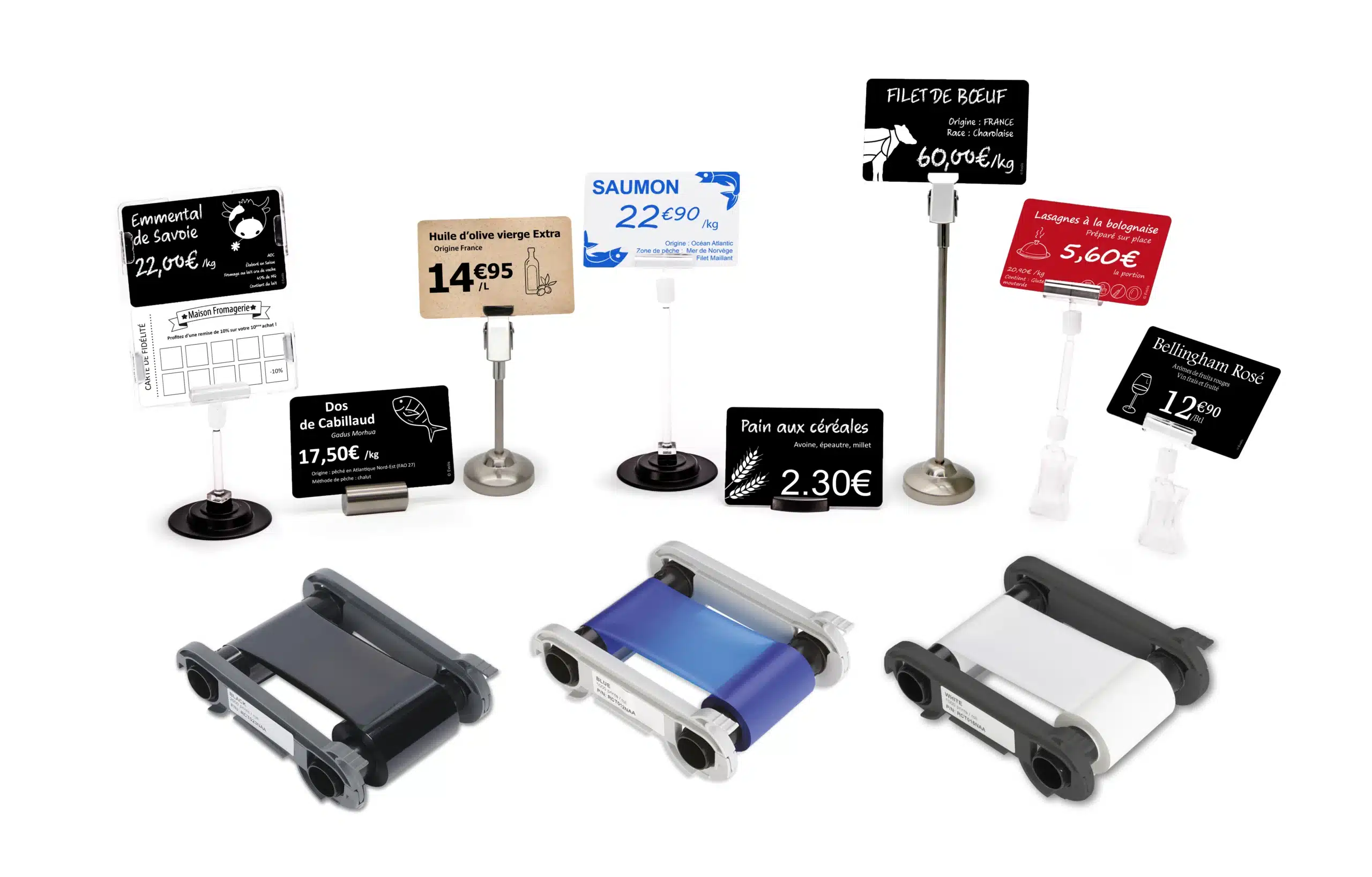 Dank unseres umfassenden Sortiments an Karten und Farbbändern sind zahlreiche Kombinationen von Preisschildern möglich.