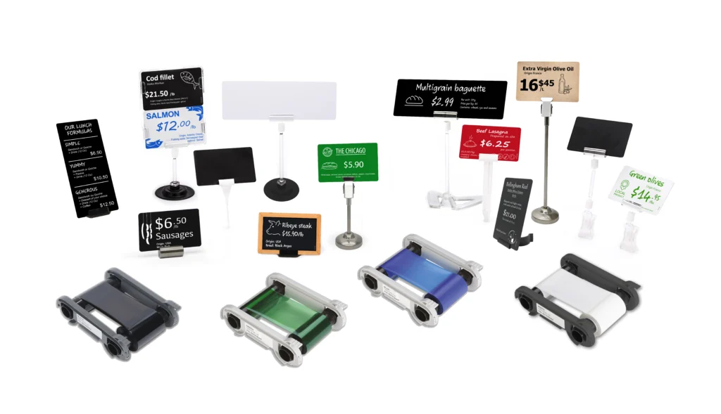 Dank unseres umfassenden Sortiments an Karten und Farbbändern sind zahlreiche Kombinationen von Preisschildern möglich.